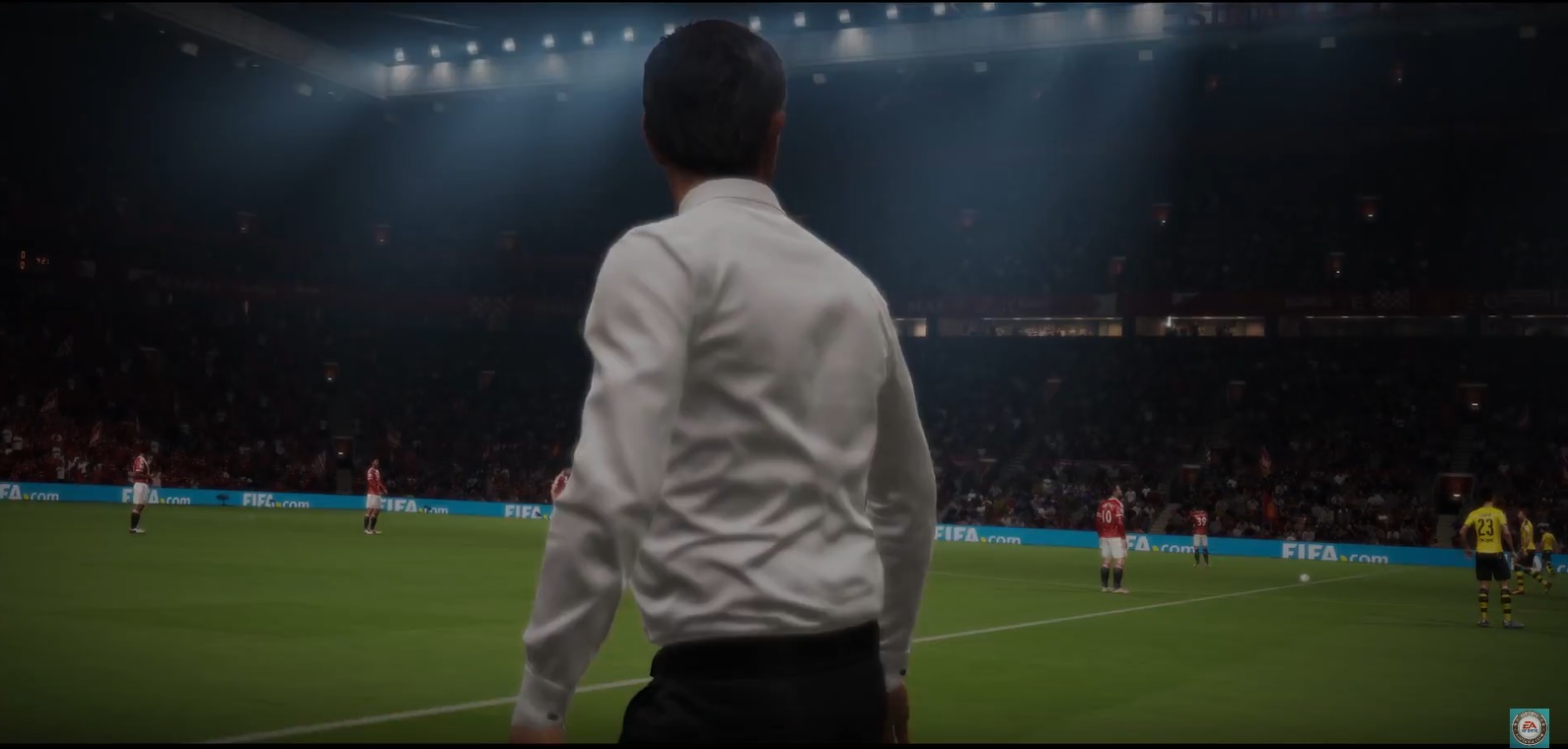 presta atención al estadio etc, el jugador q esta parado a la izquierda parece de verdad, postura diferente, yo nunca vi un jugador de fifa parado asi (no tanto los otros de amarillo)