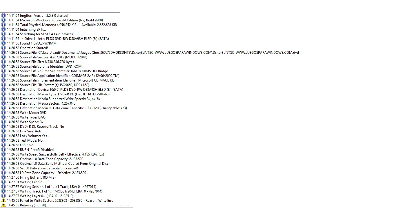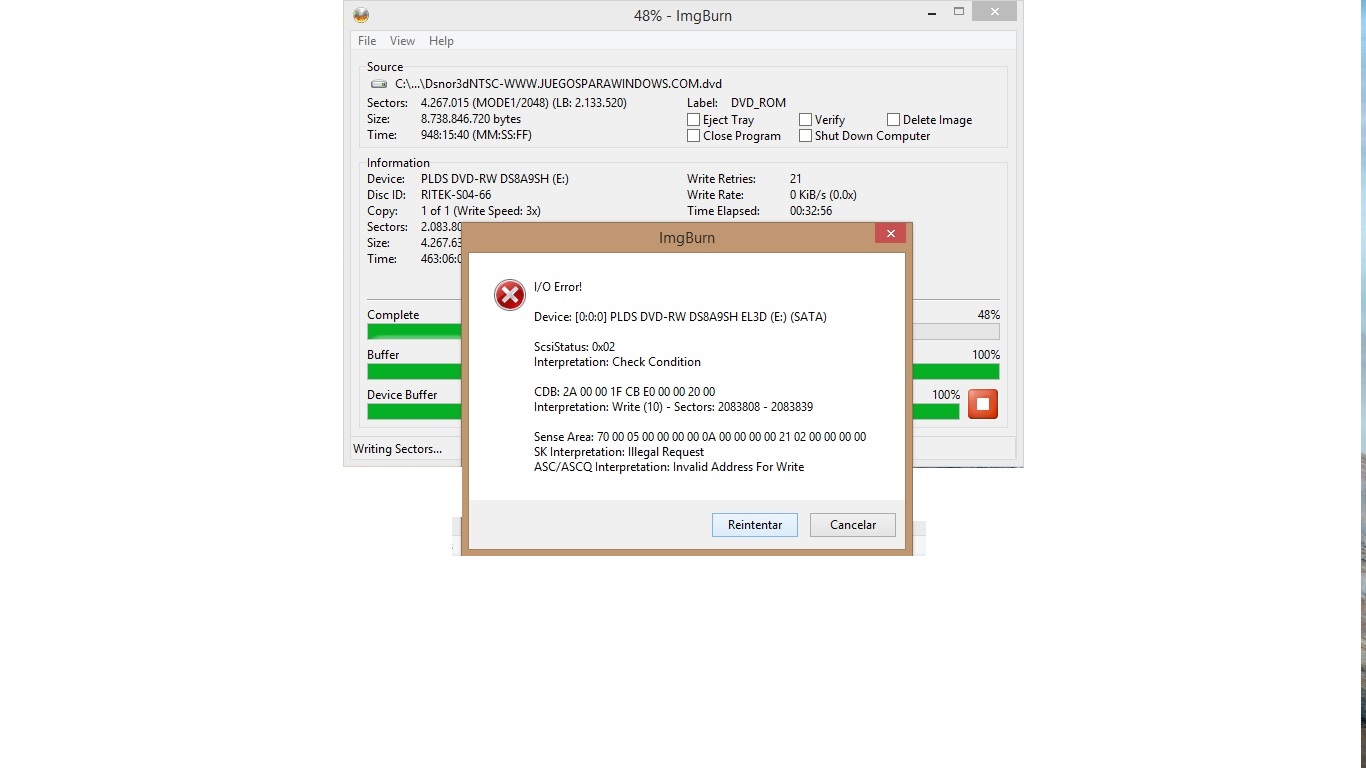 Hola a todos,tengo un problema cuando grabo,que anteriormente no había tenido,empece hace poco a grabar juegos y los primeros 4 anduvieron lo mas bien,tengo una grabadora de las comunes,es una PLDS DVD-RW DS8A9SH, uso dvds de los blancos,de id ritek,tengo windows 8.1,no toque nada de las configuraciones avanzadas,lo único que cambie fue el buffer a 513 y el main y device al 60% los dos y grabe a 2x,en la xbox anduvieron lo mas bien,hace poco quise grabar el Dishonored,ya llevo 4 discos tirados a la basura,siempre se me queda la grabación al 47/48%,no se que es lo que pasa,acá les dejo fotos del error que me da el imgburn y del log.