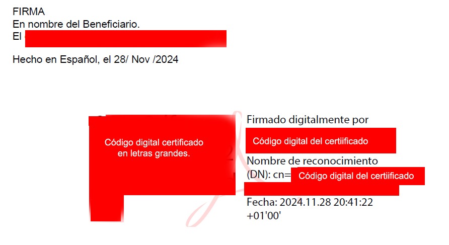Me dice "Firmado digitalmente por ....... y Nombre de reconocimiento (DN); cn=....... Fecha (la correcta)."