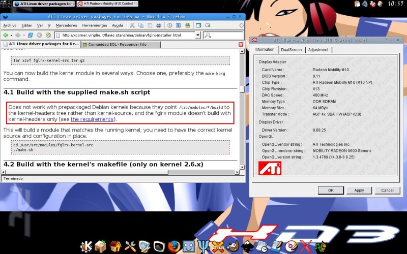 Como digo, despues de tener los requisitos exigidos, he hecho el make-kpkg y modprobe fglrx y he cambiado en el XF86Config-4 los drivers "ati" por "fglrx" (todo como root, usando su) y al reiniciar las X he probado con el tuxracer y va genial.
