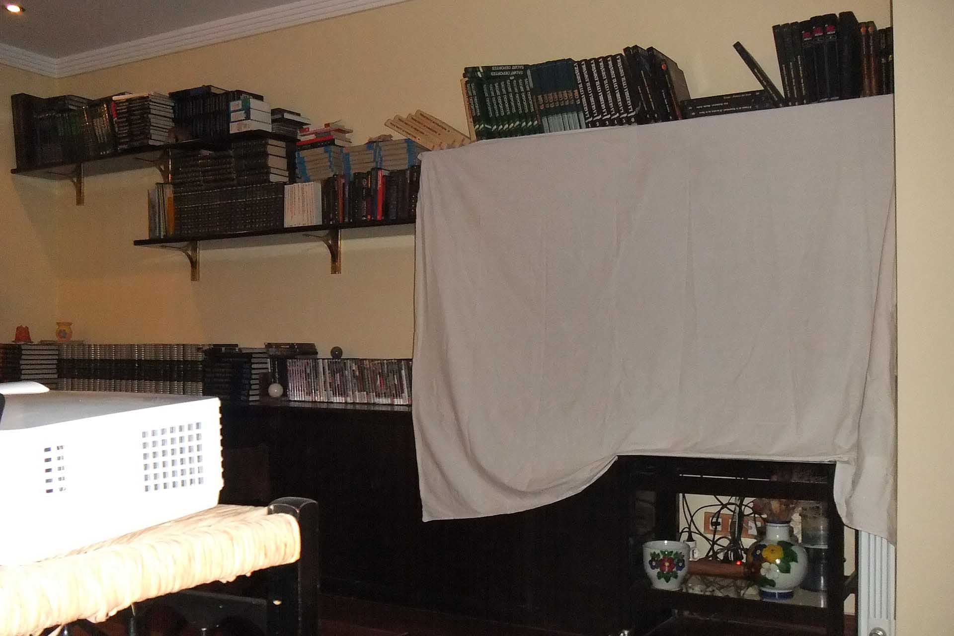 Empezaré proyectando sobre una sábana y más adelante miraré de buscar algo más permanente. Ahora mismo es imposible, además de por el presupuesto, porque voy a proyectar sobre sobre todo en la habitación, sobre la pared donde esta la puerta, así que tendría que ser una pantalla que se pudiese recoger.