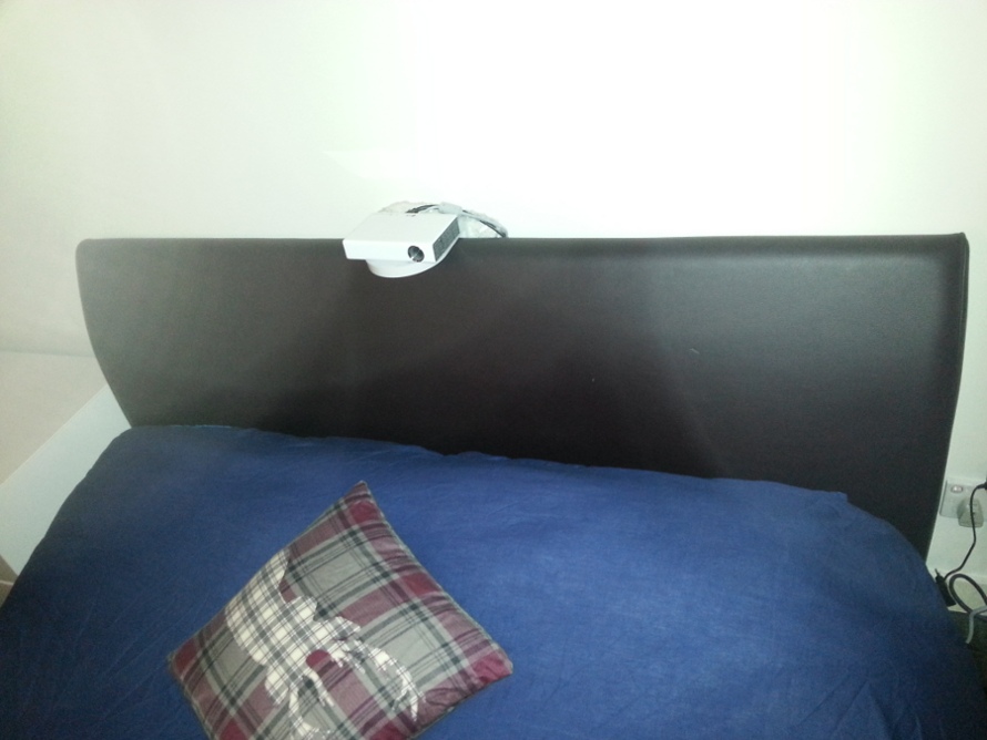 Por cierto, me he buscado un invento un tanto extraño para poner el proyector en mi habitaciónHe comprado un soporte de cámara de seguridad tipo DOMO, lo he puesto apoyado en el respaldo de mi cama, lo he aprisionado contra la pared y he puesto el proyector encima del soporte.