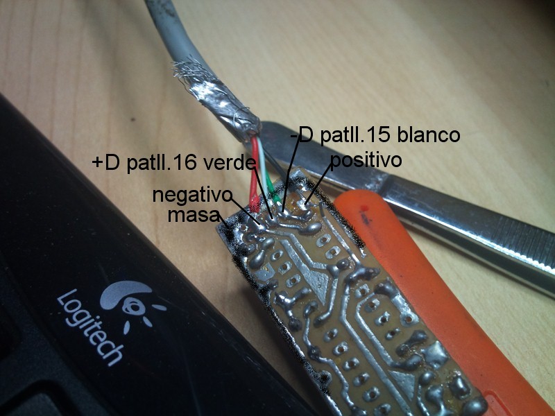 en kuanto a las konexiones usb... he medido continuidad entre los conectores del usb y lso cables pelados, para saber ke kolor korrespondia a cada pin, y luego los e soldado, segun creo yo,donde deberian ir con respecto a lso conectores del usb