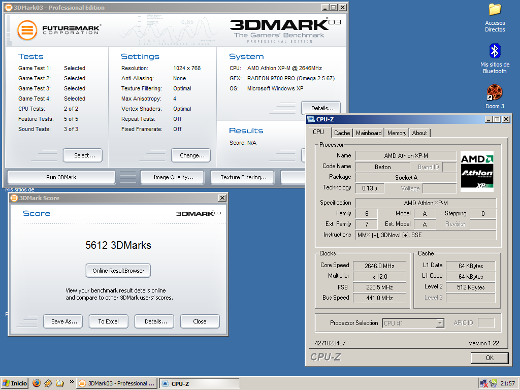 Marca y velocidad de procesador: Athlon XP-M 2400+@2646Mhz (220x12) vcore 1,938v