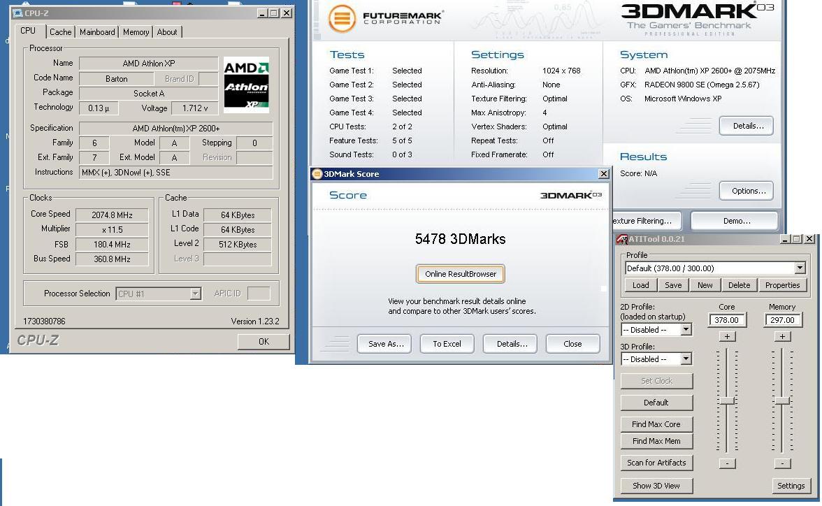 La gráfica tiene memorias de 3,3 nanos pero me salen artefactos si la paso de 303 mhz, quizás necesite un poco más de voltage, el core sube a 372 mhz sin problemas (mientras no haga calor