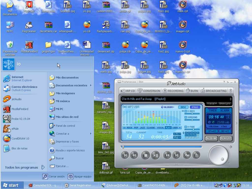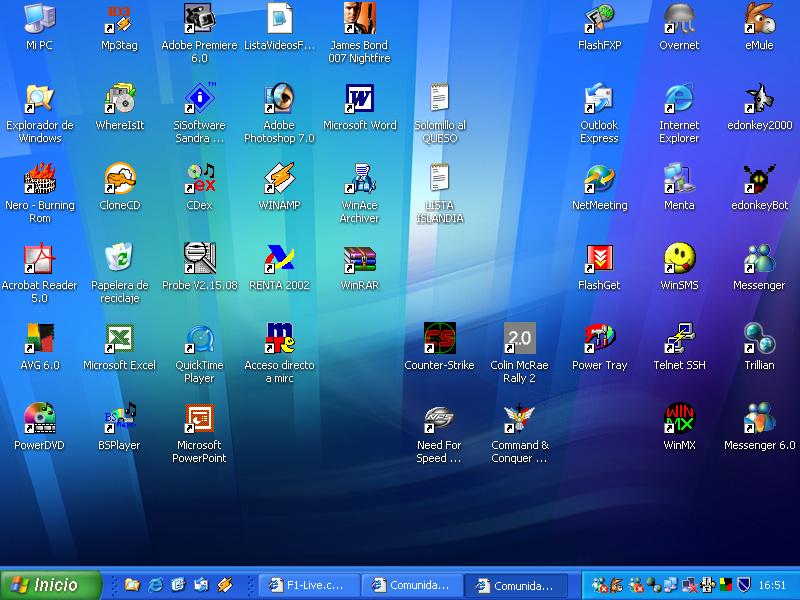 weno aqui mi xp... el orden en el escritorio no vale un carajo si luego se tiene instalados mil millones de programas de dudosa procedenciaXD ya posteare a mi amigo linux