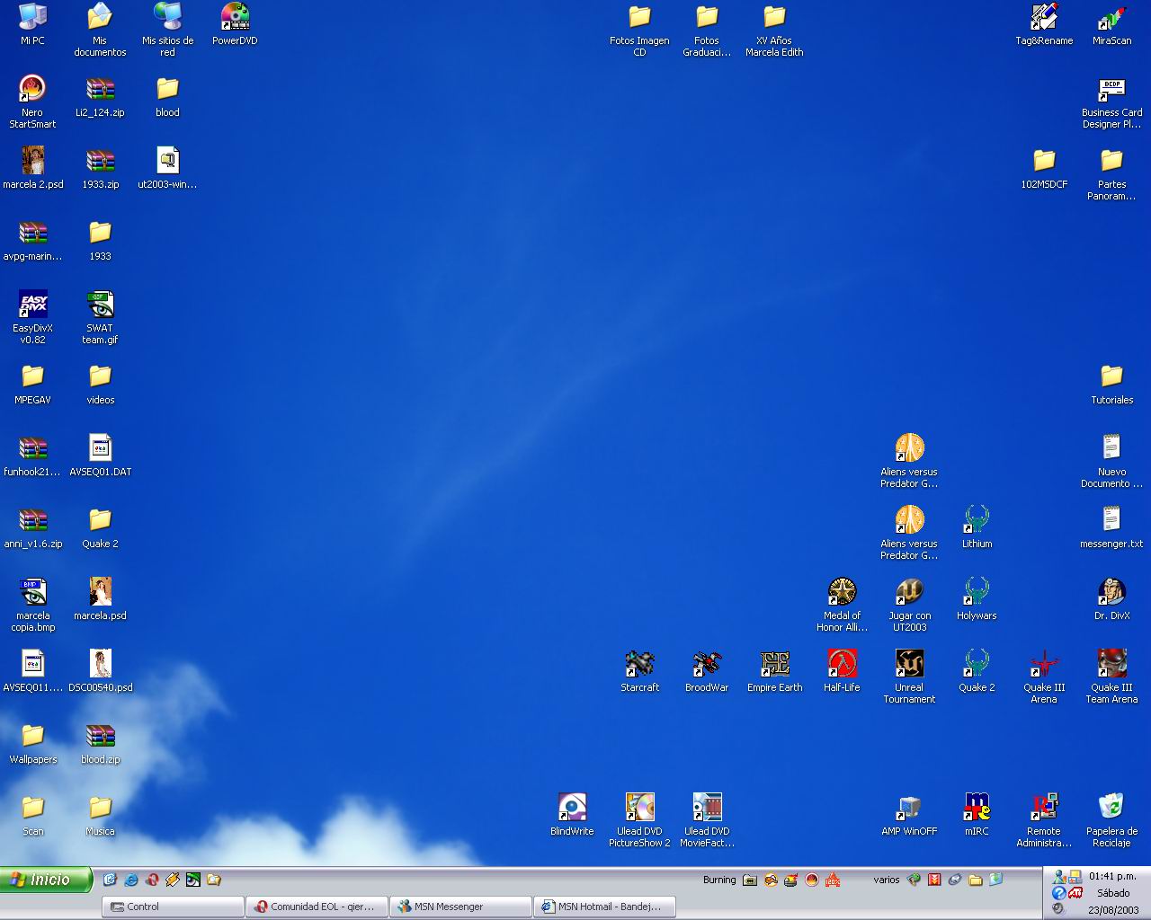 Aqui va el mio, no se si lo parecera pero yo soy hasta maniatico con el orden [poraki] . En el escritorio no tengo nada, donde guardo las cosas es en mis documentos, quien me entre ahi a desordenar lo rajo xDD