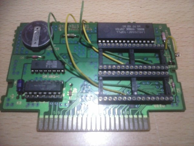 los cables salen de debajo del zócalo (tiene las dos patas cortadas) y van a la parte trasera de la placa. es la forma en la que he cruzado los pines que hay que cambiar, para que en el zócalo pueda poner la eprom directamente