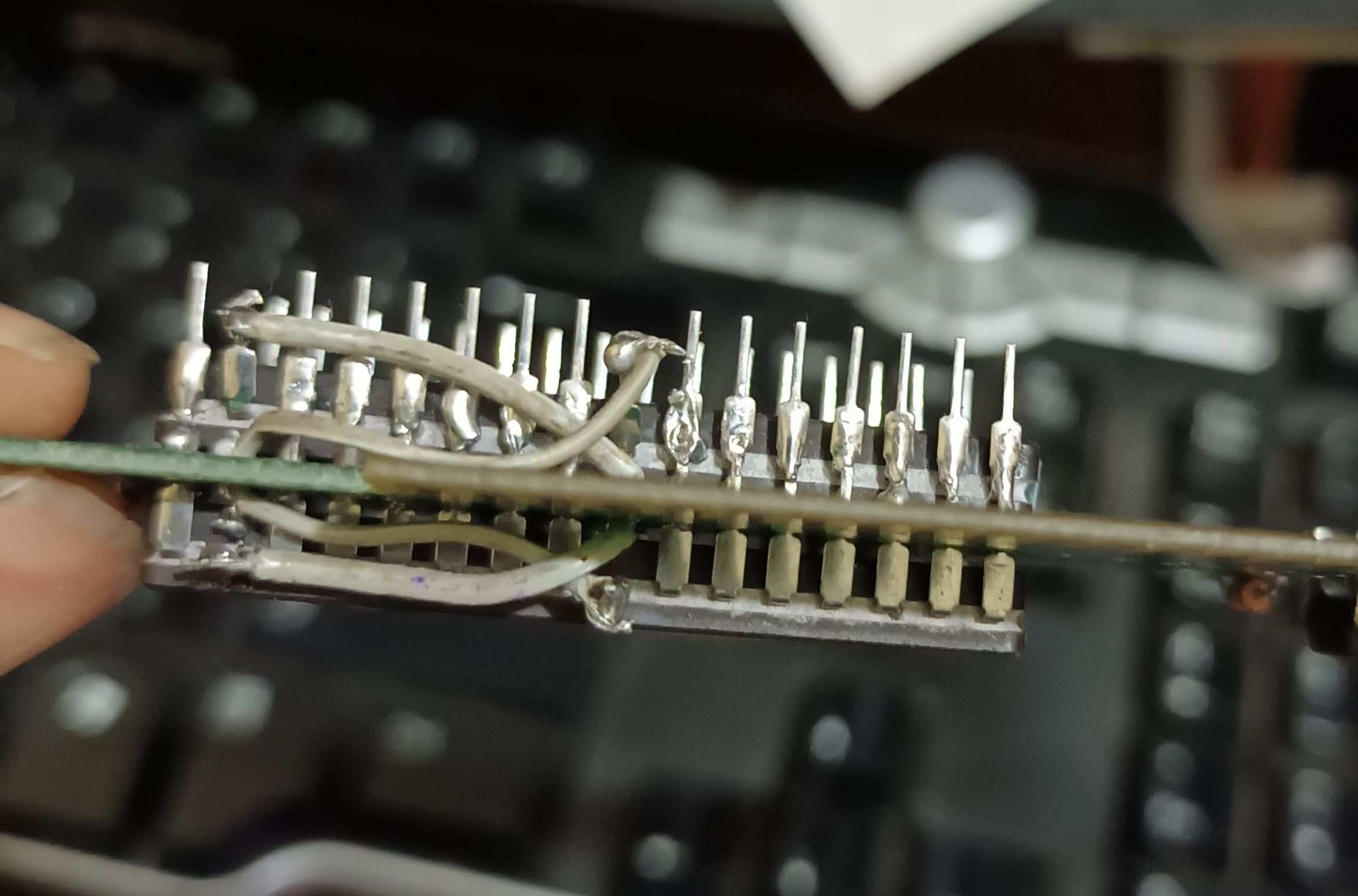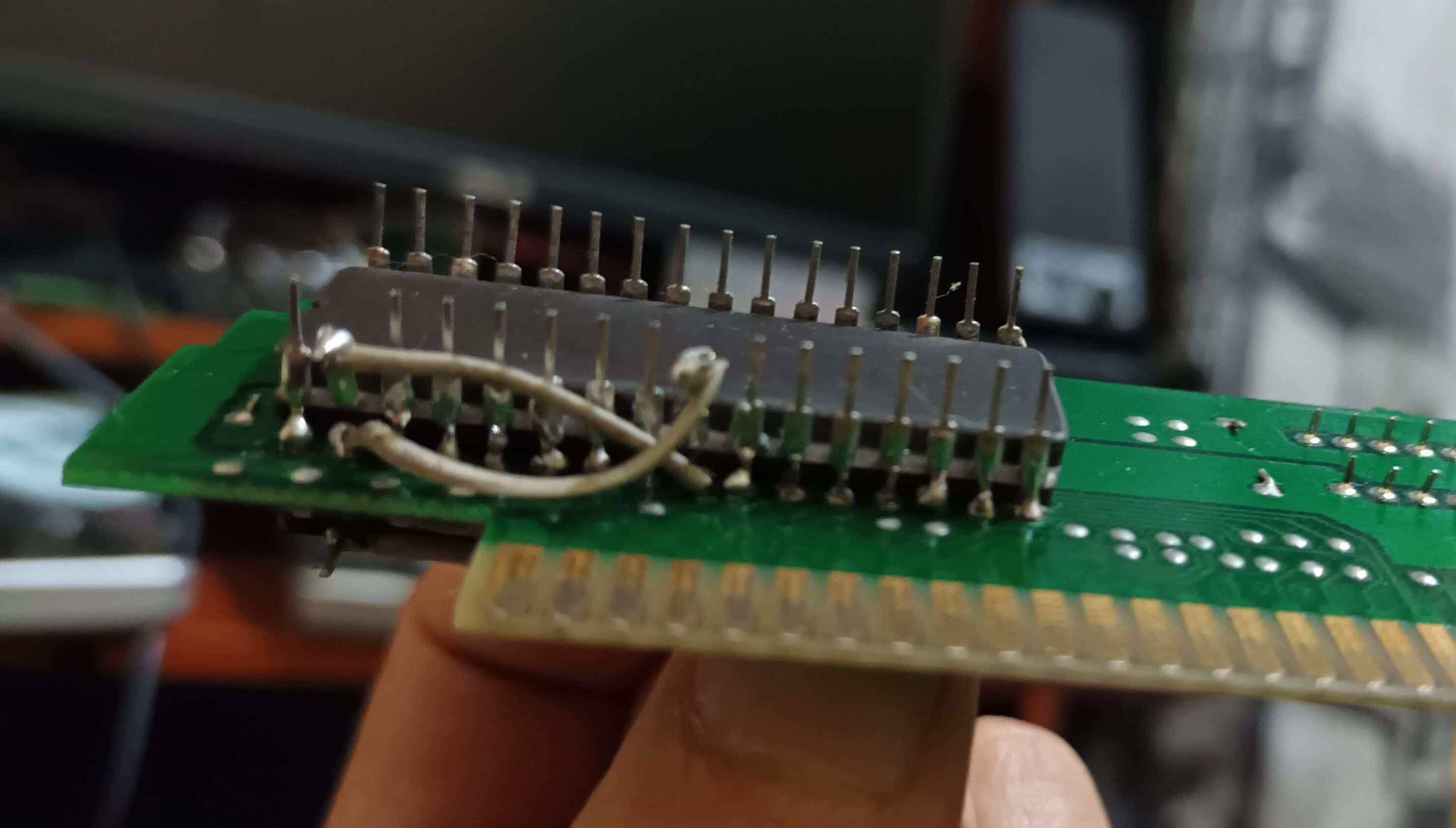 1 La memoria posee un adaptador de sop44 a pdip42 a un portachip cableado a los respectivos pines donde va el maskrom original, para poder usar las 2 memorias monte una sobre otra y solde todos los pines, separé los CE para poder seleccionar cada una al momento de programar y los OE para el enrutamiento.