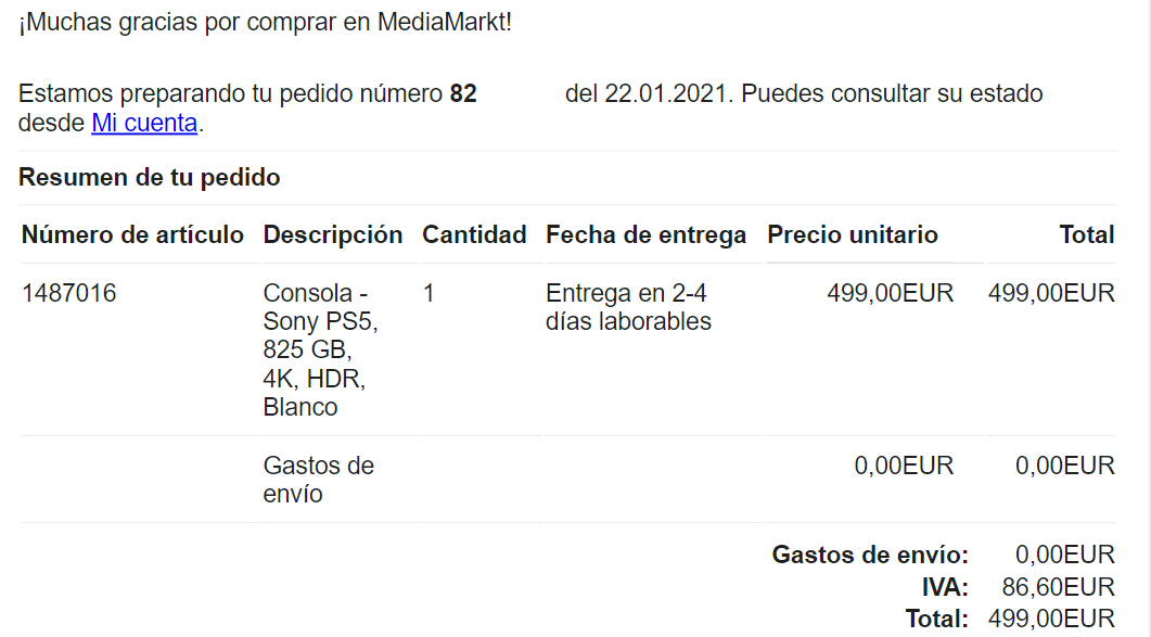 Ted-Mosby escribió:Yo lo he conseguido, pero no tengo mail de confirmación que siempre me llega ni sale en la pagina en mis pedidos. A los demás os sale igual? Eso sí, el dinero me lo han cobrado.