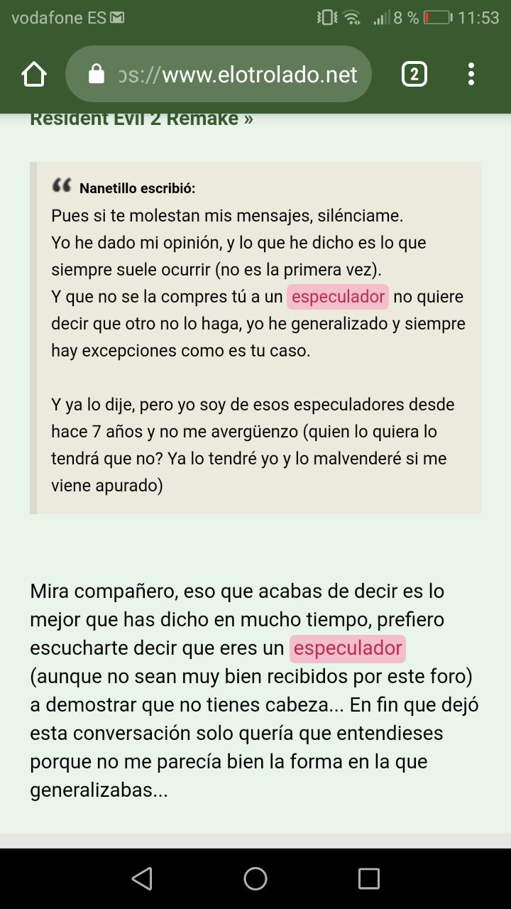 Sí estar pendiente de un hilo, proponer un sistema de ceder ediciones a los que les falten y participar activamente en dar info sobre dónde reservar y demás te parece que ha sido por mi parte una conducta de "garrapata" no tengo nada más que hablar contigo. Tú buscas una edición para un amigo tuyo, yo busco ediciones para gente que ni conozco pero que nada más que de haberlas conocido día a día en la mafia repudiada de Telegram hace que para mí valgan la pena y sea una satisfacción que todos los del grupo pillen una, y no no te voy a mentir los demás me la pelan. De aquí salimos escamaos, con amenazas, con gente diciéndonos que ojalá la figura nos llegasen decapitadas, de tirar abajo todos nuestros planes de ayudar al prójimo de eol... Y si, claro que pedí a un buen compañero que si podía reservasr una en Game y por suerte no hizo ni falta y por ello tengo ahora que MENTIR COMO UN BELLACO? Decir que si, que seguro que la vais a conseguir? Que xtralife ha sacado 10000 Uds más?