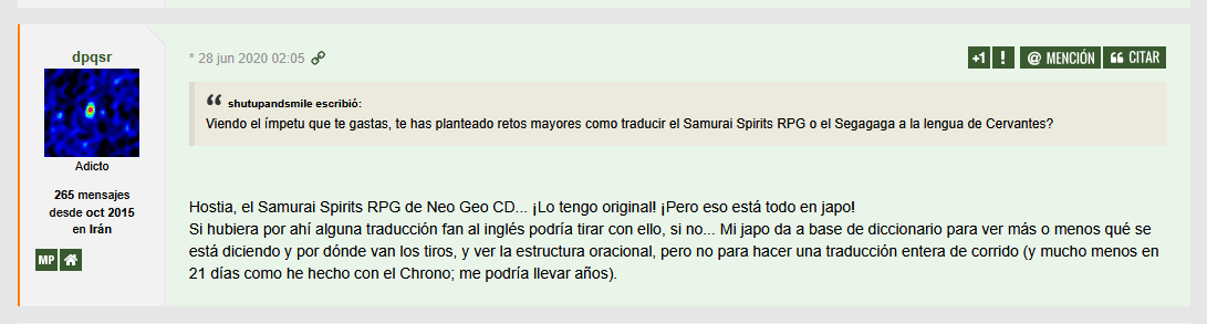 dpqsr escribió: Recordad que gracias a un hilo como éste en lengua inglesa de hace años sobre una de mis traducciones (que tiene por cierto harto romhacking inédito en lengua inglesa) conseguí el trabajo en Retro-bit (compañía con la que huelga decir que mi relación no ha cesado).