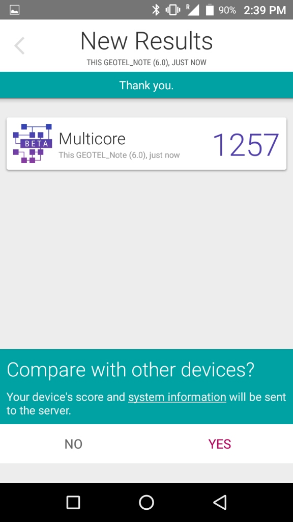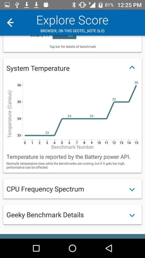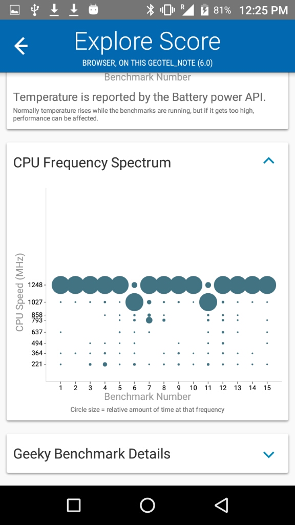 Nota acerca de los resultados de los benchmarksHay que tener en cuenta que estos resultados son meramente referenciales. Es muy probable que si ejecutas estos benchmarks mas de una vez, tendrás mas de un resultado y muchas veces pueden variar de forma sensible. Esto puede suceder por muchos factores (temperatura del dispositivo, carga de memoria mientras se realiza la prueba, conexión a internet, cambios en los sensores como puede ser mientras se mueve el dispositivo, etc, etc). Por esta razón, en muchas ocasiones realizo 3 pruebas de cada benchmark y presento las que mejore puntuación obtiene (por que asumo que es la que mejores condiciones ha tenido para ejecutar dicha prueba)