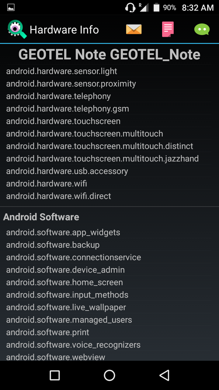Información desde el propio dispositivoInformación obtenida mediante herramientas de software directamente desde el dispositivo..Para tener una fuente fiable de información del sistema, he obtenido información desde el mismo dispositivo, ya sea desde la misma información que me proporciona el sistema Android (que generalmente es mas bien escueta), como utilizando otros programas que logran sacar mucho mas información, y de forma mas detallada, con lo que nos podemos hacer una idea general del dispositivo en su conjunto.