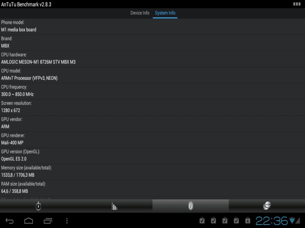 He obtenido las siguientes especificaciones desde el mismo sistema android, utilizando los programas Antutu Benchmark y Quadrant Standrad.