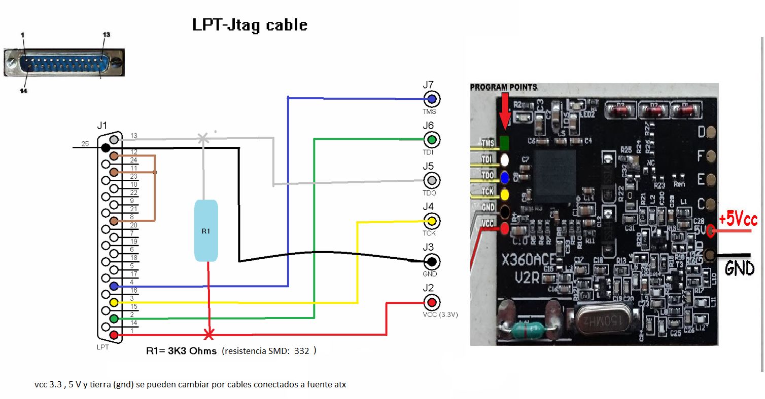 - Programador Coolrunner casero por LPT (los puntos del Coolrunner son los mismos y tienen también el mismo orden
