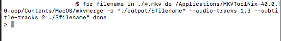 for filename in ./*.mkv; do /Applications/MKVToolNix-40.0.0.app/Contents/MacOS/mkvmerge -o "./output/$filename" --audio-tracks 1,3 ./$filename"; done