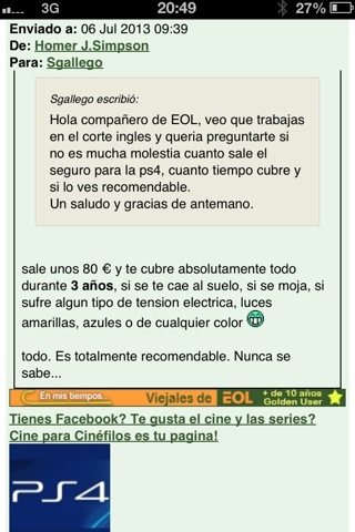 ,¿pero la PS4 por 40€?,compré hace unos meses una tele LED,contraté el seguro de 3 años en total,por 46€.€ arriba,€ abajo,el seguro es lo mejor. Sgallego escribió:sientotriana escribió:Para los que lo compren en ECI tambien hay seguro de extension de garantia 3 años en total y roturas y averias 40€