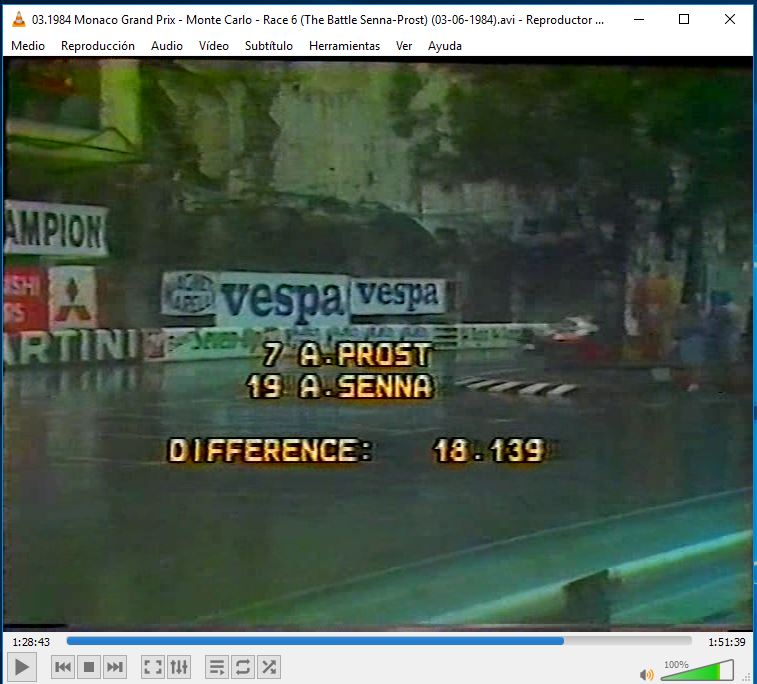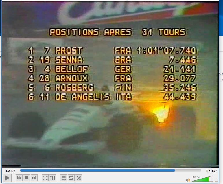 No te puedo decir mucho, porque ni los puntos de control, ni el cronometraje de antes es el de ahora, si te puedo decir, que en la vuelta 31, creo recordar que es una antes que paren la carrera, Prost sacaba a Senna casi 8 segundos y casi 22 a Bellof, cuando paran la carrera, no hay tiempos posteriores, pero si te digo, que Prost pasa y en menos de 3 segundos pasa Senna, y ya se para la carrera. Repito, no dudo de la calidad de Bellof, ni del talento, ni de las 1000 cosas que se digan de esos valientes con esos coches, o como se dice cariñosamente, aquellos locos tarados, con esos locos cacharros, pero yo te aseguro que esa carrera no la hubiera ganado otro que no hubiera sido Senna, y repito, tengo la carrera, el que desee se la paso.