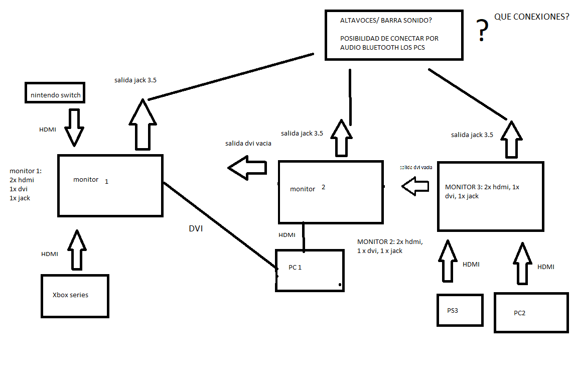 *** Puedes usar un switch [conmutador] de audio analogico, debera tener 3 entradas y una salida, con el boton o perilla que tenga seleccionaras que entrada es la que ira al equipo de audio, aqui no hay problema de que tengas varios monitores con señal de audio, puesto que el switch de audio es el que selecciona de cual monitor se enviara el audio al equipo de sonido