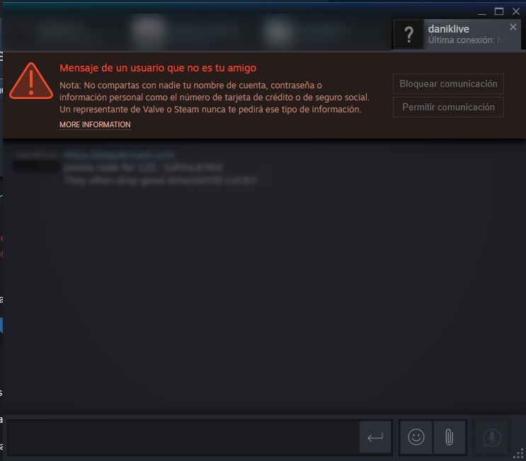 Por lo menos Steam tiene el detalle de avisarte con un cartelón rojo y bien grande tapando la conversación hasta que le des a desbloquear o no.