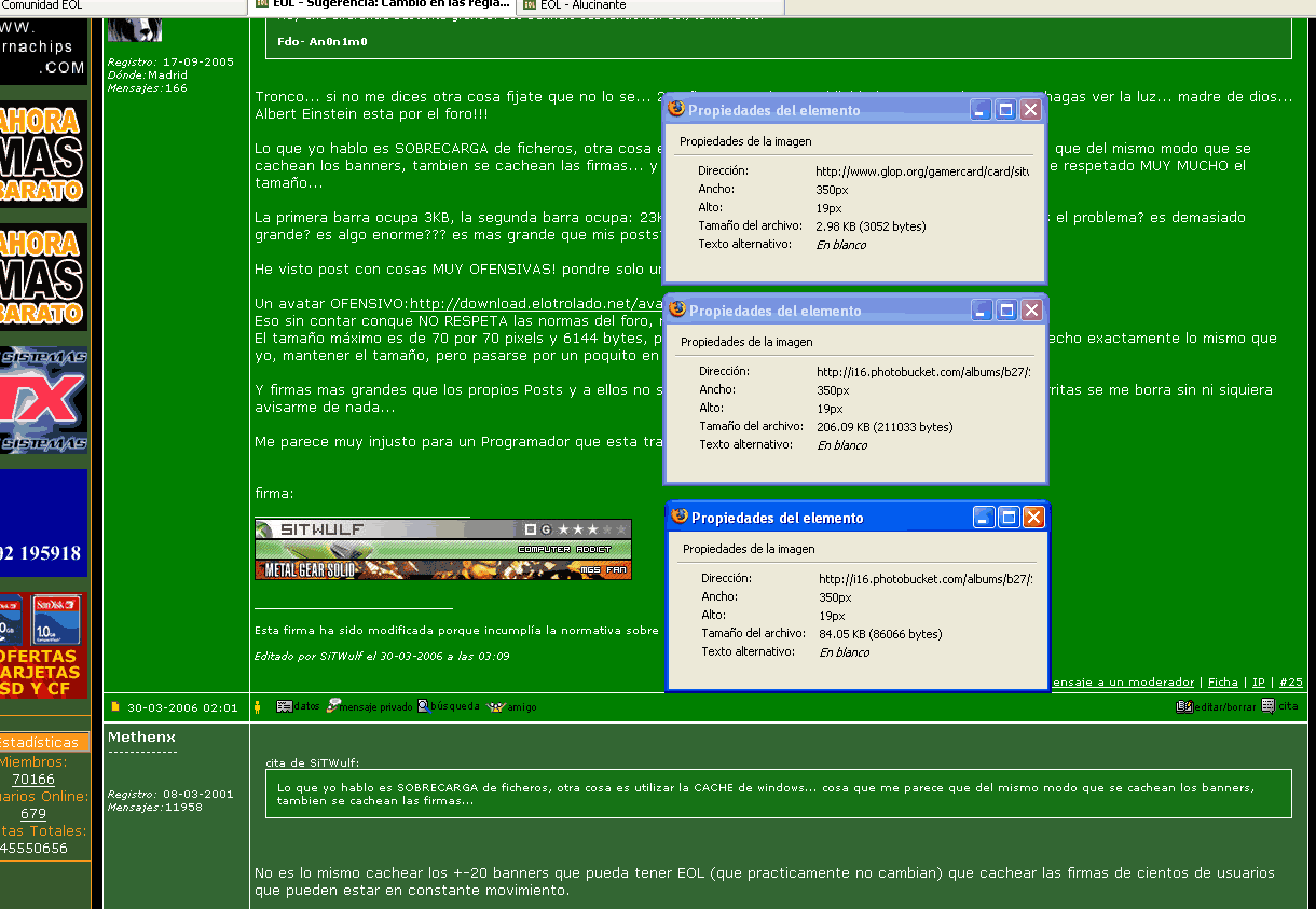 Lo que yo hablo es SOBRECARGA de ficheros, otra cosa es utilizar la CACHE de windows... cosa que me parece que del mismo modo que se cachean los banners, tambien se cachean las firmas... y vamos... que mi firma esta ENTRE LOS MARGENES... he respetado MUY MUCHO el tamaño...