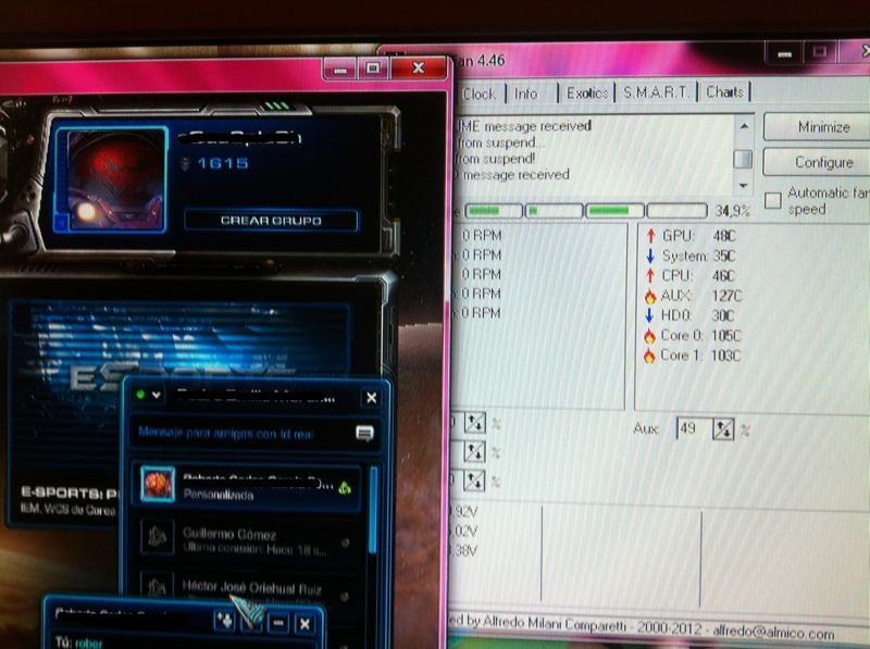 Todo parecía ir bien. El CPU en reposo no superaba los 35ºC. Sin embargo fue a la hora de abrir el juego cuando todo pareció irse al garete: Aun cuando la CPU no alcanzaba los 45ºC, los núcleos (cores) se ponián en valores que superaban los 100ºC. Utilizando varios programas para medir temperatura (everest, core temp, gpu fan...) y mostrándoseme en todos los mismos valores he de pensar que las mediciones no están falseadas. Adjunto una foto con las temperaturas que alcanzan los núcleos teniendo en SC II en modo ventana mientras navego por los menús.