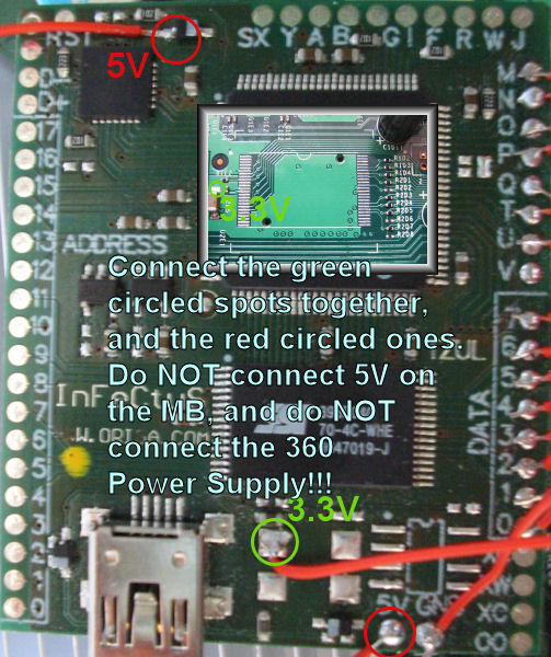 The 5V and GND points on the infectus have to be connected to a 5V supply and GND (GND on both the chip AND the 360 MB).. DISCONNECT 5V from the 360 MB!! (Infectus could take the 5V from USB).