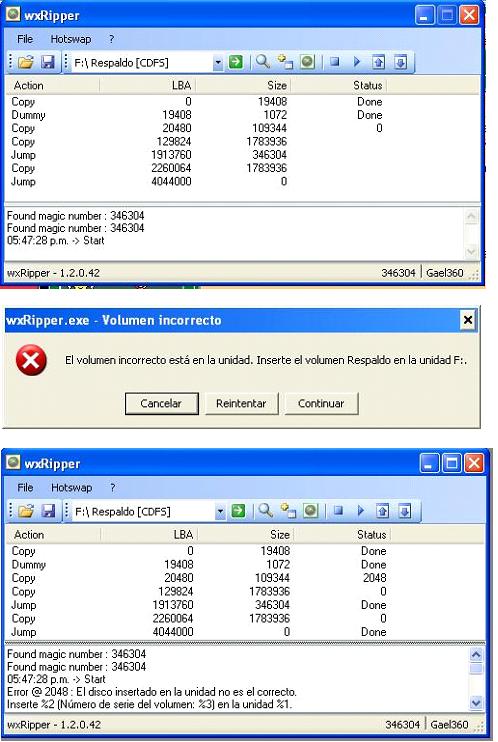 hola, espero que esten bien, disculpen tengo un problema con el wxripper, el problema es asi; sigo los pasos de acuerdo al tutorial, inserto un DVD 8.120 GB, y realizo los actividades indicadas, al sacar la bandeja del DVD, con el alfiler, inserto el juego PGR3, le doy Find Magical Key y me muestra el mismo numero del dvd que inserte anteriormente, bueno una ves hecho esto creo el ISO, con el Start dump y se inicia la creación todo el proceso va bien hasta ese paso, pero una ves iniciado el proceso me marca unos errores de primero me aparecia que