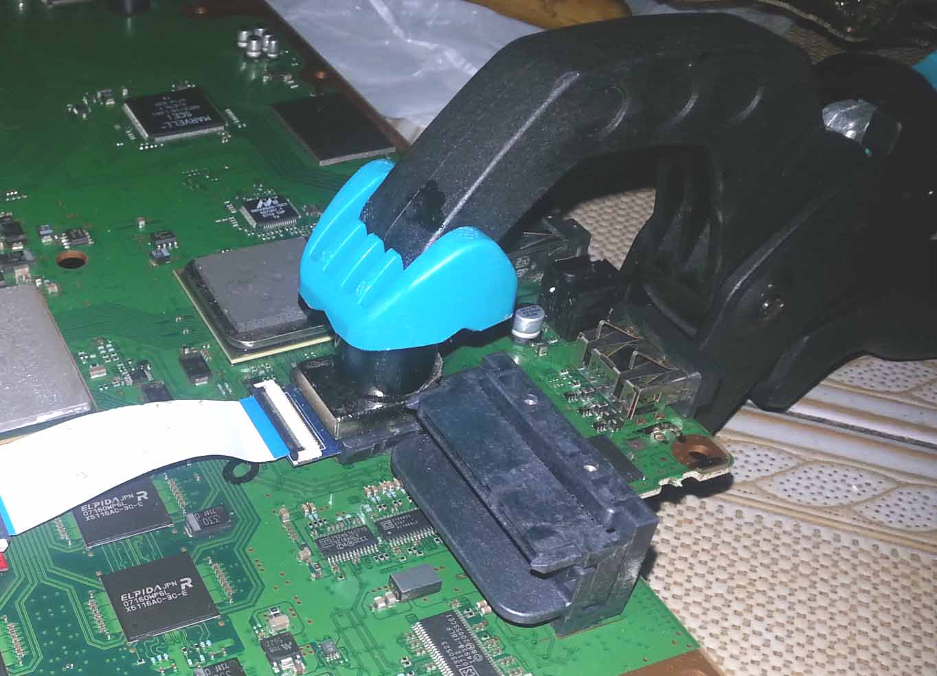 Por otra parte cubriremos el lado contrario a las NANDs de la placa base de la PS3 con cinta aislante, para proteger los componentes de la fricción directa con el sargento que más tarde usaremos.