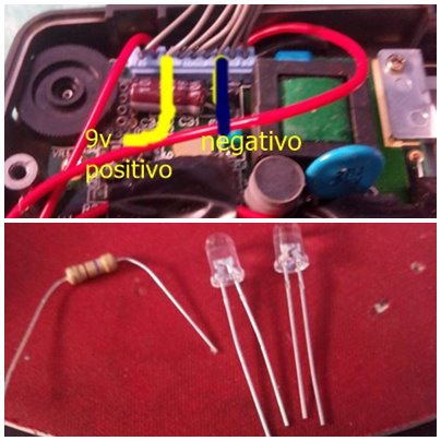 cuando soldemos el positivo de 9v lo soldamos a la resistencia a una pata( por que los led que venden son de 3v y nosotros tenemos 9v y tenemos que bajar la tensión.ahora con la otra patilla de la resistencia le soldamos 2 cables y lo unimos a cada patilla positiva de cada led,( la pata positivo es la mas larga).(antes de hacer esto, desoldar el fluorescente y meter los led en los soportes negros que aguantan al fluorescente)