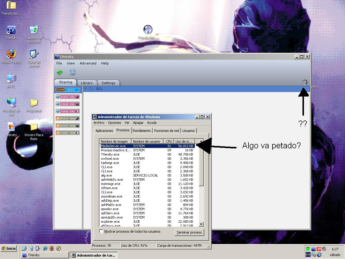 En administrador de tareas, procesos, el que me come a muerte es el mediaserver.exe, el ordenador es viejo, pero no malo, un pentium 2.4ghz. (que conste que el transcoder lo tengo desconectado completamente) La foto de acontinuación no está hecha con el programa recién puesto, llevaría puesto mas de 1h...
