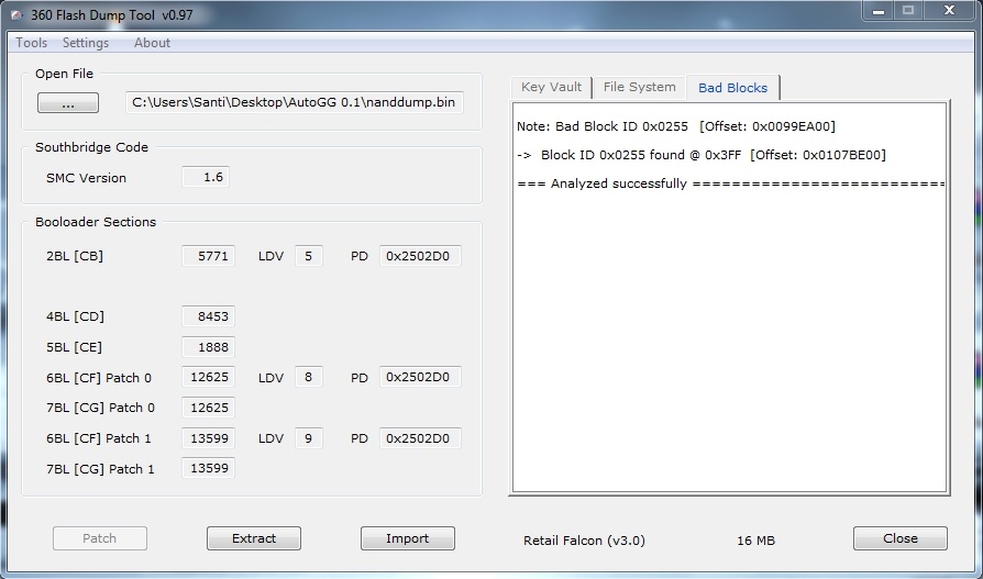 Hola estoy tratando sacar la nand de mi falcon, con el matrix nand flasher, he utilizado el nandpro 2.a, b,c,d y la 3 y me lee la nand con un bad block, sin problemas. El tema es que trato de abrirlo con el 360 Flash Dump Tool v0.97, pero me sale el siguiente mensaje "Couldn't read file or This image is unsupported! ", he utilizado el degraded 1.1b y he conseguido abrirlo, previamente editando dentro del fichero la fecha con un editor hex y me devuelve que tengo un CB version 5771 LVD7. La pregunta es si es normal que no me lo abra con el 360 Flash Dump Tool. Muchas gracias