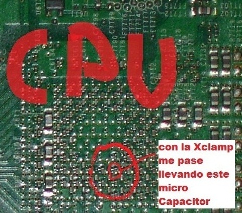 pero ante la idea de RROD me dispuse a limpiarla y ponerle disipadores alas memorias el MOD de Ventilador acelerado y cambiar pasta termica todo bn el detalle fue al querer quitar las xclamp quite el de la gpu todo bn quite el Xclamp del Cpu y lo hice mal q me pase llevando un Capacitor de la Cpu unos que son super pequeños