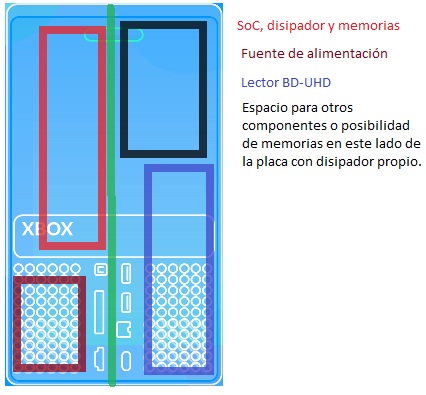 Si lo piensas la one X tambien lleva la placa en medio, debajo lector y hdd y encima fuente y disipador.