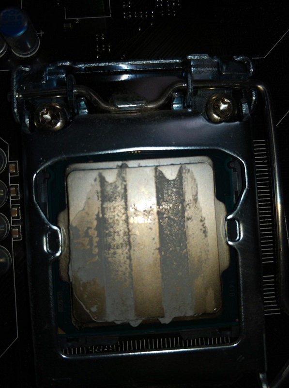 Al levantar el disipador para cambiarle la pasta, pude observar que el procesador no tenía pasta térmica esparcida por toda la superficie, se veían como dos franjas rectangulares por el centro, y huecos por los lados (voy a añadir imagen para que se vea).