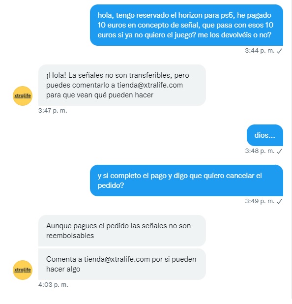 mayhem escribió:No es por hacer un poco de abogado del diablo, os entiendo y a tope con que se devuelvan las reservas, pero también puedo entender un poco la otra parte, no me compareis GAME una multinacional que está en toda europa con Xtralife que al final es una tienda online pequeña española.