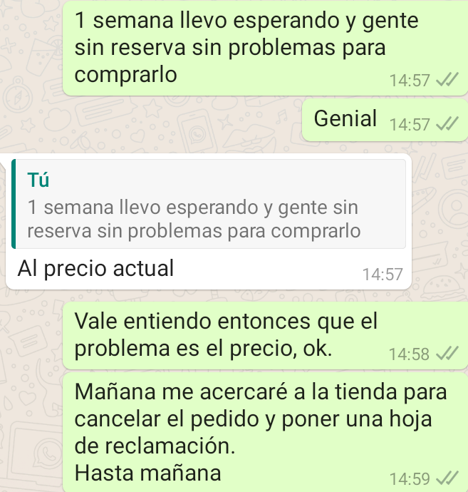 Me cierran sin capacidad de responder ni nada, curioso el "No se envían antes de la fecha" pero a la vez "puede que mañana te llame para la entrega", sigue en preparación pero hare eso, le diré al transportista lo siento pero no te lo voy a coger y ya está.