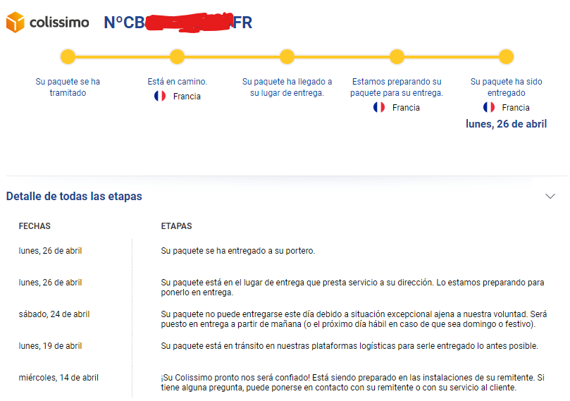 En la página de Square me aparece como que lo han enviado ya y usando el número de seguimiento para LaPoste del correo de confirmación del pedido me aparece, con fecha de ayer 26 de abril a las 8am, "Su paquete está en el lugar de entrega que presta servicio a su dirección. Lo estamos preparando para ponerlo en entrega." y "Su paquete se ha entregado a su portero.", pero no he recibido ningún correo/SMS de Seur y el juego no me ha llegado.