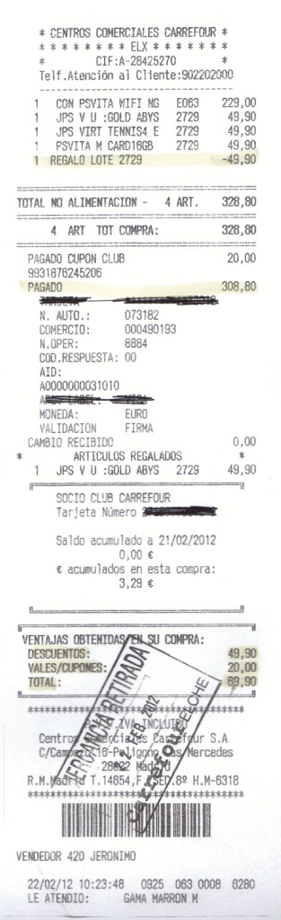 . Me aplica el descuento de 20 euros por la consola pero me dice que no vale lo del 10% en videojuegos, en este no he querido insistir porque no tengo argumentos (pone que no es acumulable en la letra pequeña). Os adjunto una copia del tiquet de compra (308,80 euros) donde viene el 3X2 aplicado en juegos Y accesorios por si se ponen farrucos en el carrefour.