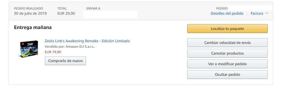 El caso es que éste 12 de junio, precompré en amazon mi copia de "TLOZLA" tal cual se pudo hacer eso ya en la página. Que por cierto, los 53 dólares ( comprado desde aquí pero recibiendo una versión yankee del juego al parecer ) me los cobraron al momento. Durante esta semana he ido consultando mi pedido en la web, y no sólo se espera entrega a partir del 3 al 12 de octubre (¿?) , sino que esos 53 dólares se han convertido en 78'19 supongo que con portes de aduana y demás. Llegando a ser muy cercanos al importe de una de esas ediciones especiales que a mí no me interesan.