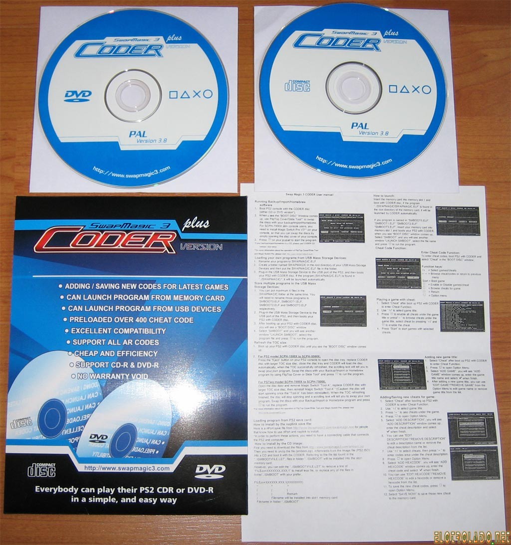 En el otro lado tenemos el Swap Magic 3 Plus Coder Version 3.8. Ya analizamos en su día el Swap Magic 3.3, a continuación salió la versión 3.6 que añadía carga de ejecutables desde dispositivos USB, y en esta nueva versión 3.8 se incluye como novedad un sistema de trucos similar al del Action Replay. De hecho se pueden añadir nuevos códigos del Action Replay, además de los cientos ya incluidos en una base de datos no demasiado actualizada (faltan la mayoría de juegos más o menos recientes). Supuestamente cada nueva versión también incluye mayor compatibilidad con juegos problemáticos, aunque en este caso no hemos podido confirmarlo. En cualquier caso sigue echándose en falta el soporte para DVD9 y mayores TOCs (son las de siempre, 622MB y 4,35GB).