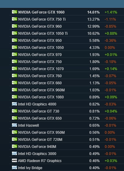 Hace pocos días Steam reveló los resultados de la encuesta sobre hardware y software de la segunda mitad del año pasado, el periodo más concurrido de la plataforma. Según estos datos el 91 % de usuarios usa procesadores Intel y el 84 % una tarjeta gráfica de Nvidia (la GeForce GTX 1060 terminó el año como la más usada). La resolución más popular es 1920 x 1080 mientras que Windows 7 es el sistema operativo dominante.