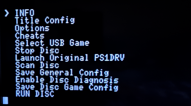 Captura de pantalla del menú de DKWDRV, homebrew de PS2 para cargar juegos de PS1