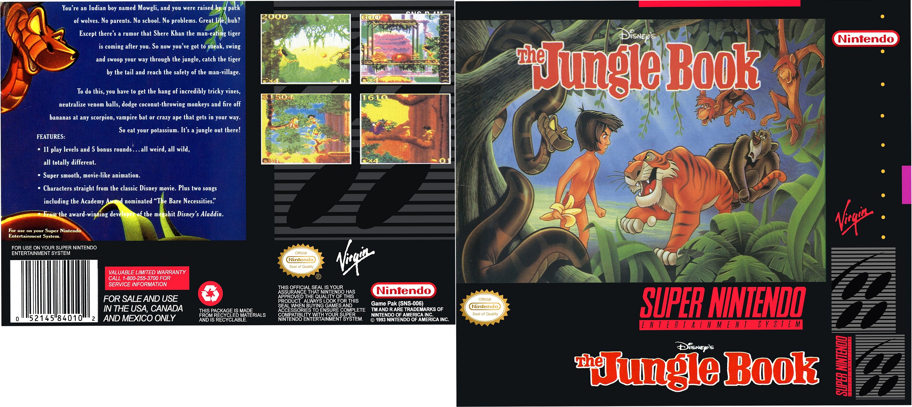 Carátula NTSC Americana del videojuego "Disney's Jungle Book" de Super Nintendo / Super Famicom. Categoría:Carátulas de videojuegos de Super Nintendo / Super Famicom. Categoría:Carátulas de videojuegos de Acción / Plataformas, de Super Nintendo / Super Famicom.