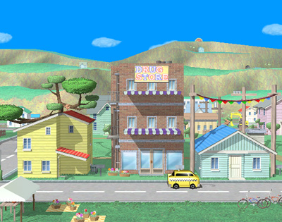 Captura de pantalla del juego Super Smash Bros. Brawl mostrando el escenario Onett.