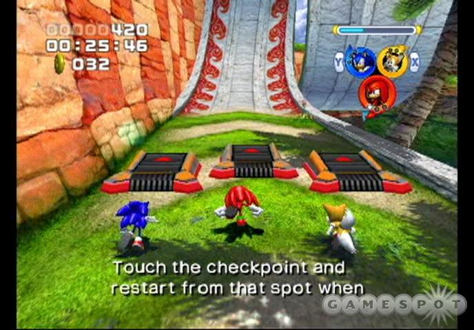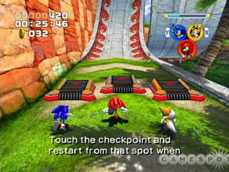 Imagen del videojuego Sonic Heroes (Sonic Team). En la imagen, el equipo "Team Sonic", formado por Sonic, Tails y Knuckles. Texto en la imagen: "Toca el punto de comprobación y comienza desde ese lugar cuando...".