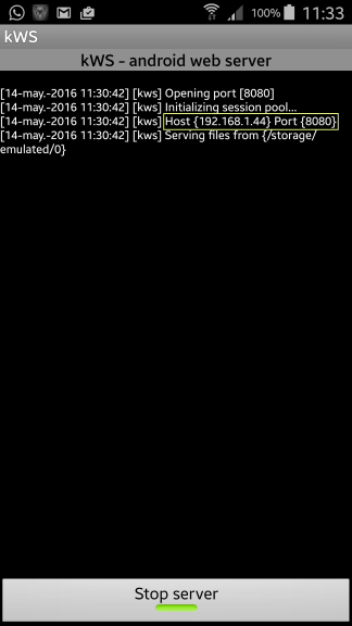 Inicia kWS en tu dispositivo Android y pulsa sobre "Start server". En la línea Host {XXX.XXX.XXX.XXX}Port{8080} se muestran la IP de tu dispositivo Android y el puerto en uso.