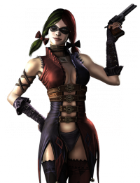 Harley Quinn: El amor nos lleva a hacer locuras. Y para la extrovertida y psicótica Harley Quinn eso significa disfrazarse, convertirse en supervillana, llevar armas que parecen de broma y asesinar a incontables ciudadanos — todo por ver una sonrisa en la cara de su amorcito. Antes de volverse loca, la Dra. Harleen Quinzel era una prometedora psiquiatra en el Hospital Psiquiátrico Arkham Asylum, hogar de los criminales dementes de Gotham. Tras conocer al Joker, la joven doctora se obsesionó con la perversa mente de los criminales. El Joker quiso aprovecharse de la ocasión y manipuló a su terapeuta hasta volverla loca y ser capaz de controlarla. Harleen se enamoró del villano, le ayudó a escapar de Arkham y dirigió su vida a hacerlo feliz y esparcir su sangrienta firma de caos. Atlética, ágil y peligrosamente impredecible en una lucha, Harley Quinn es un oponente formidable por sus propios méritos. Está dispuesta a hacer cualquier cosa para llevar más lejos las metas del Payaso Príncipe del Crimen — sin importar a qué precio ni nadie más salvo ella misma. Su personalidad energética, afable y animada es suficiente para que casi cualquiera baje la guardia — un error que les podría suponer fácilmente perder la vida. Loca y psicótica, Harley Quinn es la chica modelo de la temible atracción del caos. | |