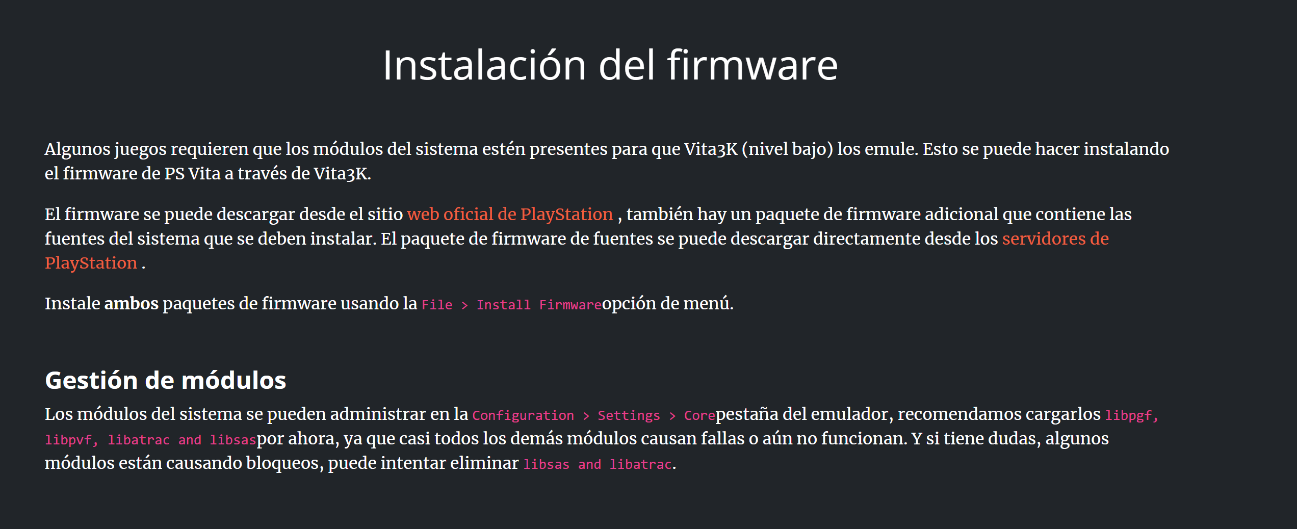 El firmware y las fuentes se descargan desde la propia interfaz del emulador, te lleva a los enlaces, de todas formas voy a poner los enlaces aquí. Primero hay que instalar el firmware del sistema PSVUPDAT.PUP y luego las fuentes del sistema PSP2UPDAT.PUP.